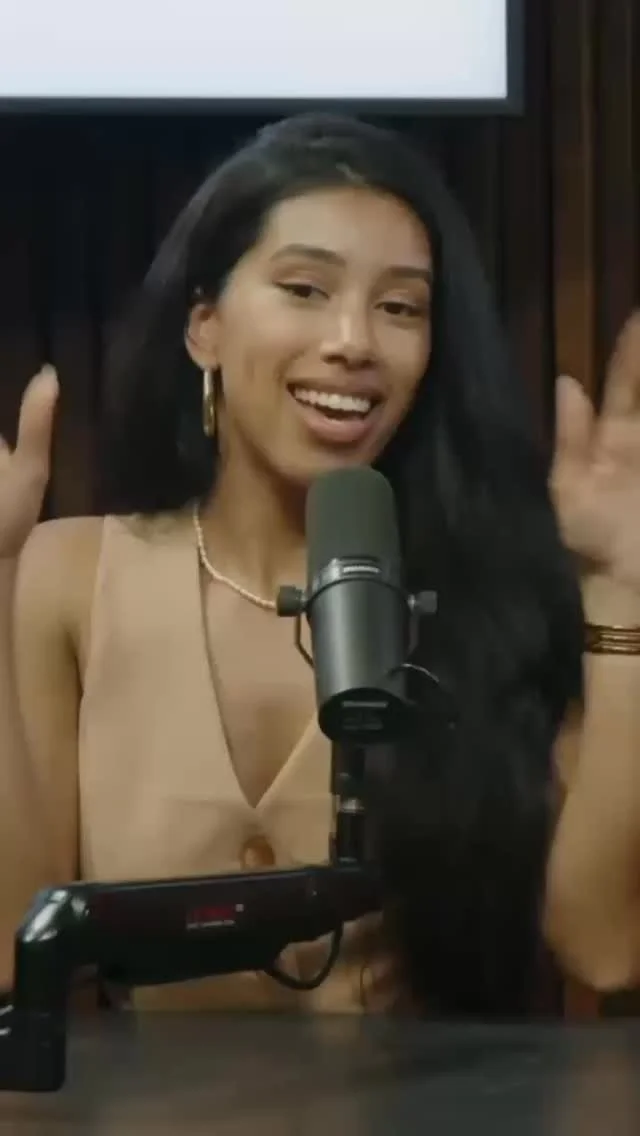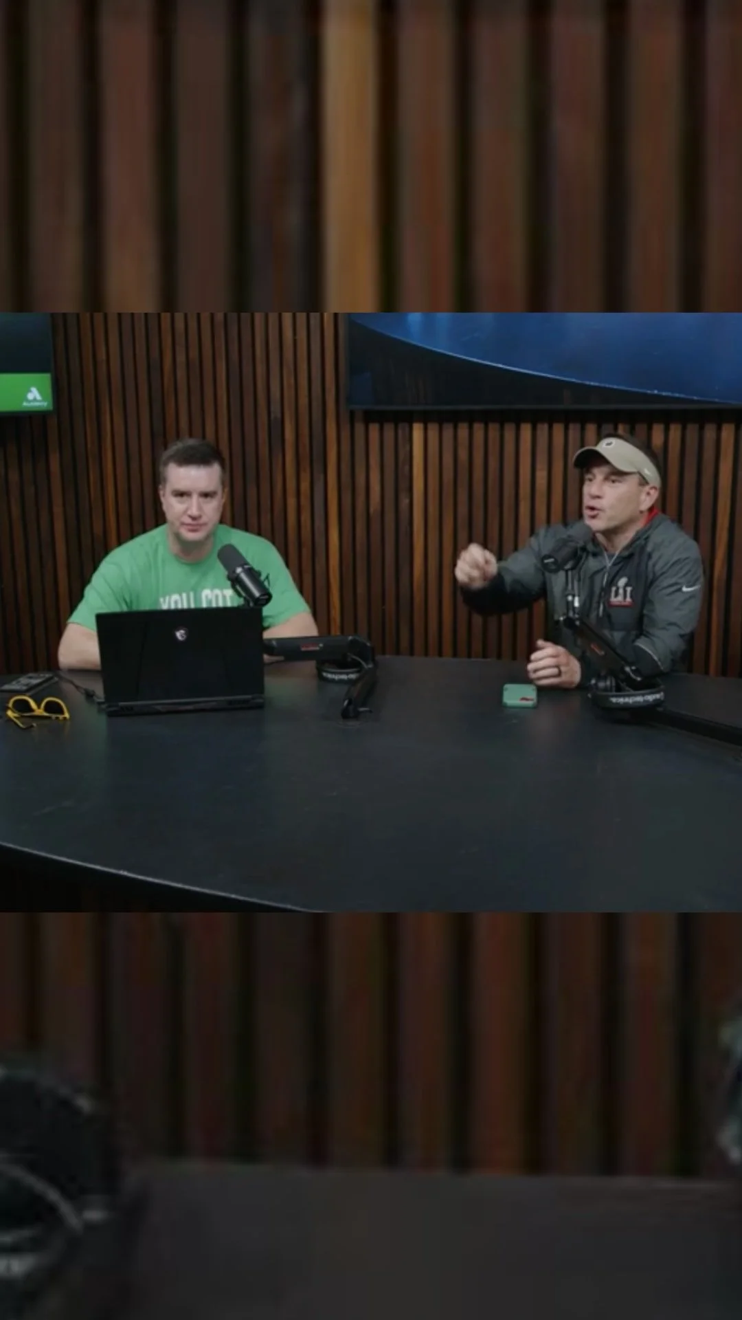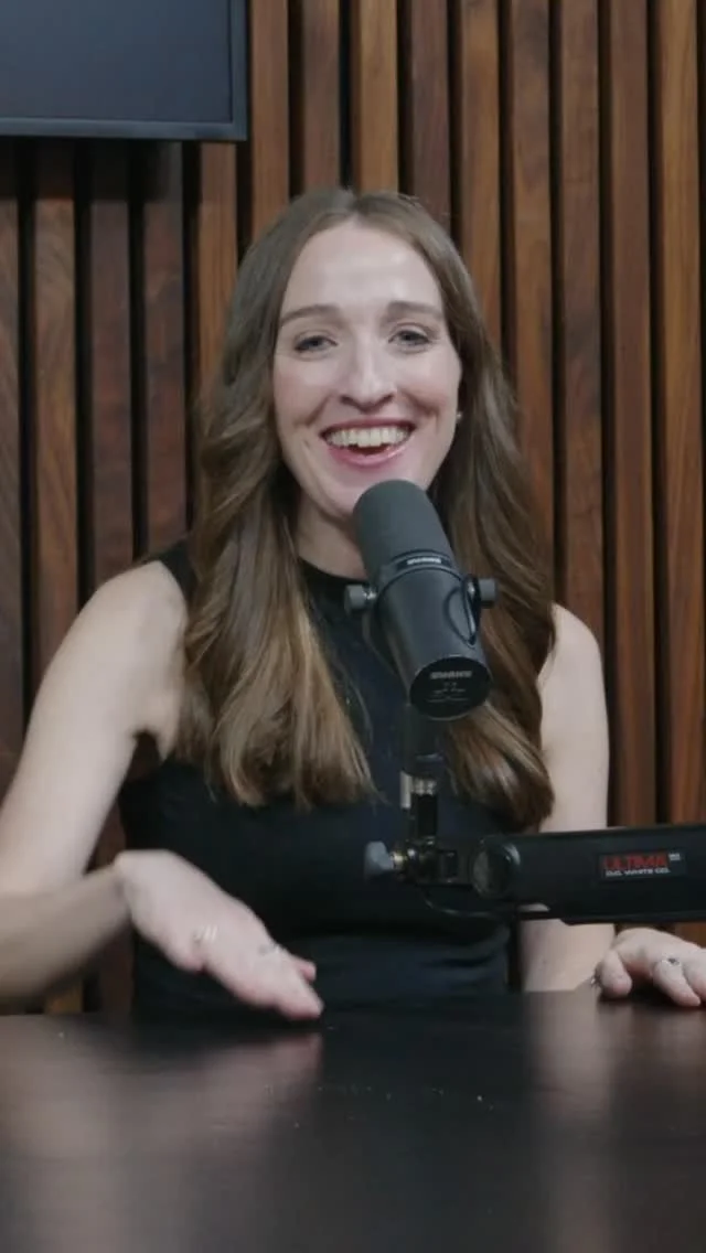 A media studio with a curved table equipped with microphones, surrounded by chairs, and large monitors on a wooden-paneled wall displaying your podcast logo.